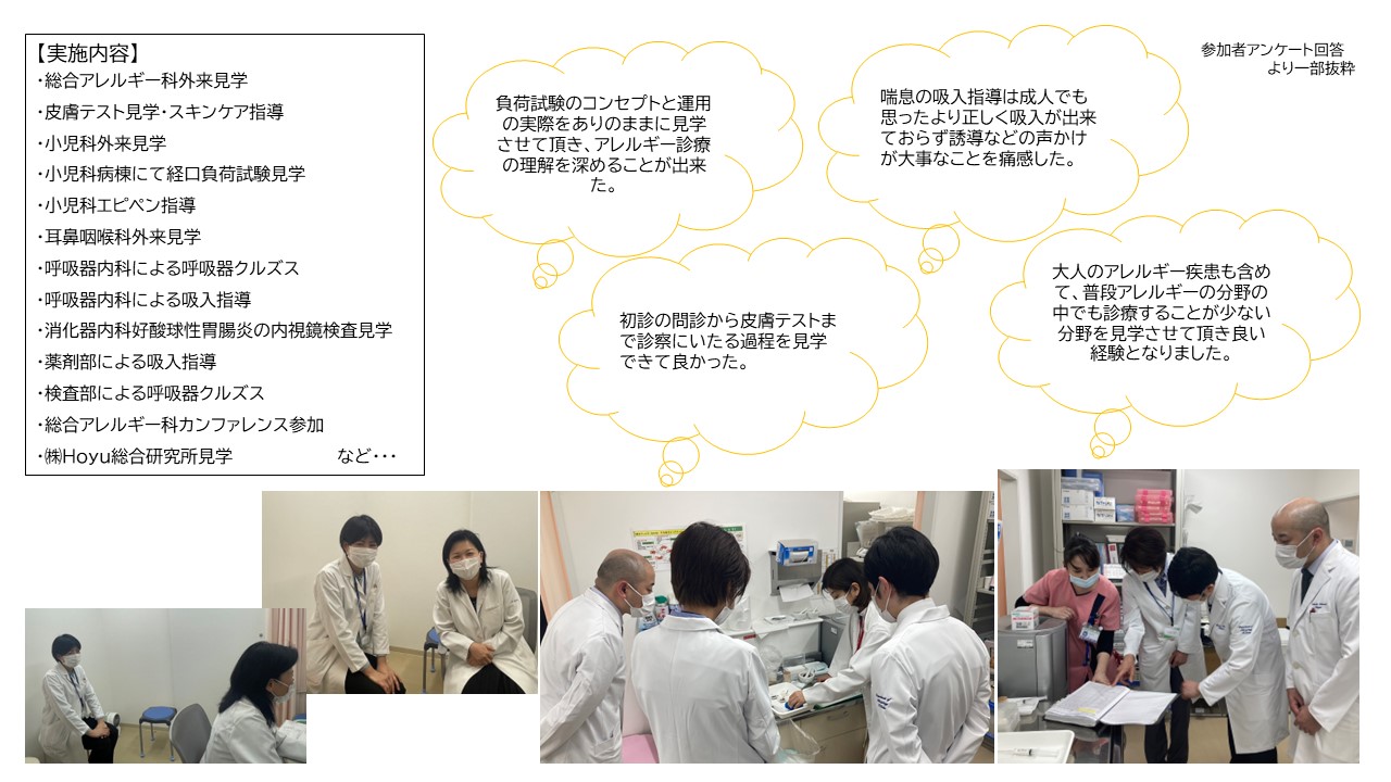 アレルギー専門医の有無を問わず、2週間のトレーニングコースで複数の診療科の外来、検査、患者指導などを学び、実践できるコースを開設しています。ご希望により1日外来見学のみ等も可能ですのでご相談ください。お申込みをいただいてから日程を調整いたします。