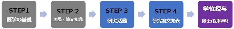 - 「研究指導」:医学研究に取り組む研究者としての知識・技能を修得し、修士論文作成に向けた研究を行う