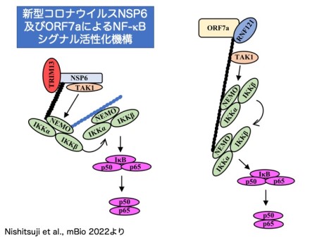 新型コロナウイルス感染症(Covid-19)の増悪には炎症性サイトカインの誘導が深く関わっている。この研究では、ウイルスのNSP6とORF7aという2つの遺伝子がそれぞれ異なる機構によってユビキチン化を受け、下流のアダプター分子をリクルートすることで、NF-kBシグナルを活性化し、炎症性サイトカインを誘導することを明らかにした。