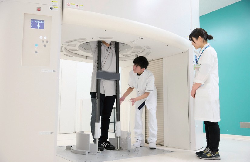 従来のように仰向けで検査を行うのではなく、立ったまま撮影できる「立位CT」が国内の大学病院の中では本学と慶應義塾大学のみで導入されています。患者が装置の中央に立つと、筒状の装置が上下に動いて体内を撮影します。座位での頭や首の内部撮影も可能です。膝関節などの運動器や呼吸器、消化器など幅広い分野の診断に用いられ、立位で撮影することで、運動機能、感覚機能、疼痛などこれまで発見しづらかった機能疾患の発見や、重力下で著明となる脊柱管狭窄症や鼠径ヘルニアなどの臨床評価において期待されています。