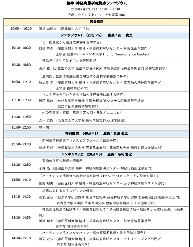 精神・神経病態研究拠点シンポジウム 開催のご案内 2025年2月27日