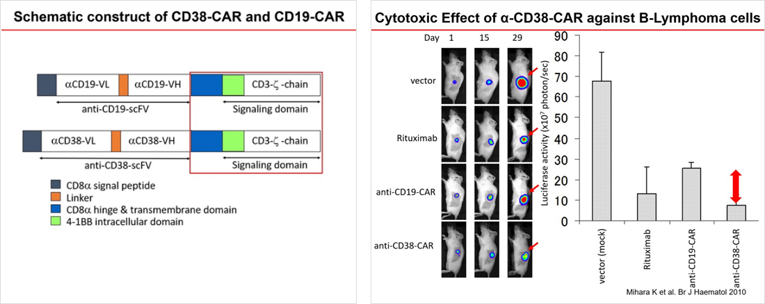 Mihara K, Yoshida T, Takei Y, Sasaki N, Takihara Y, Kuroda J, Ichinohe T. T cells bearing anti-CD19 and/or anti-CD38 chimeric antigen receptors effectively abrogate primary double-hit lymphoma cells. J Hematol Oncol 10(1):116 2017