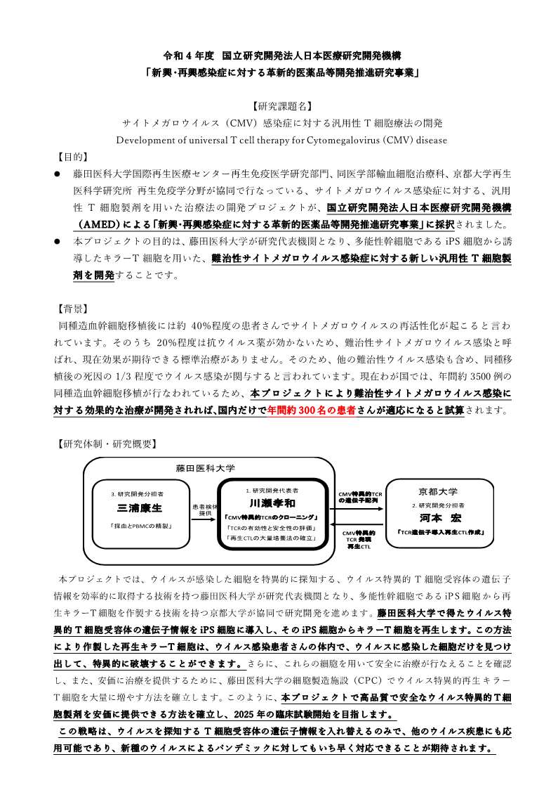 国立研究開発法人日本医療研究開発機構の「新興・再興感染症に対する革新的医薬品等開発推進研究事業」に免疫再生医学研究部門 川瀬孝和准教授 が採択されました。