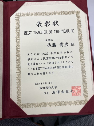 佐藤貴彦講師が「Best teacher of the year 賞」を受賞しました。