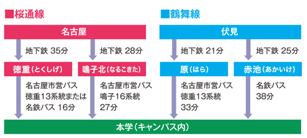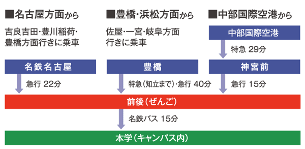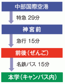 中部国際空港より金山(かなやま)駅に直行便(名鉄常滑線 / 空港線)が出ております。金山駅にて名鉄名古屋本線にお乗換え頂き、前後駅で下車してください。