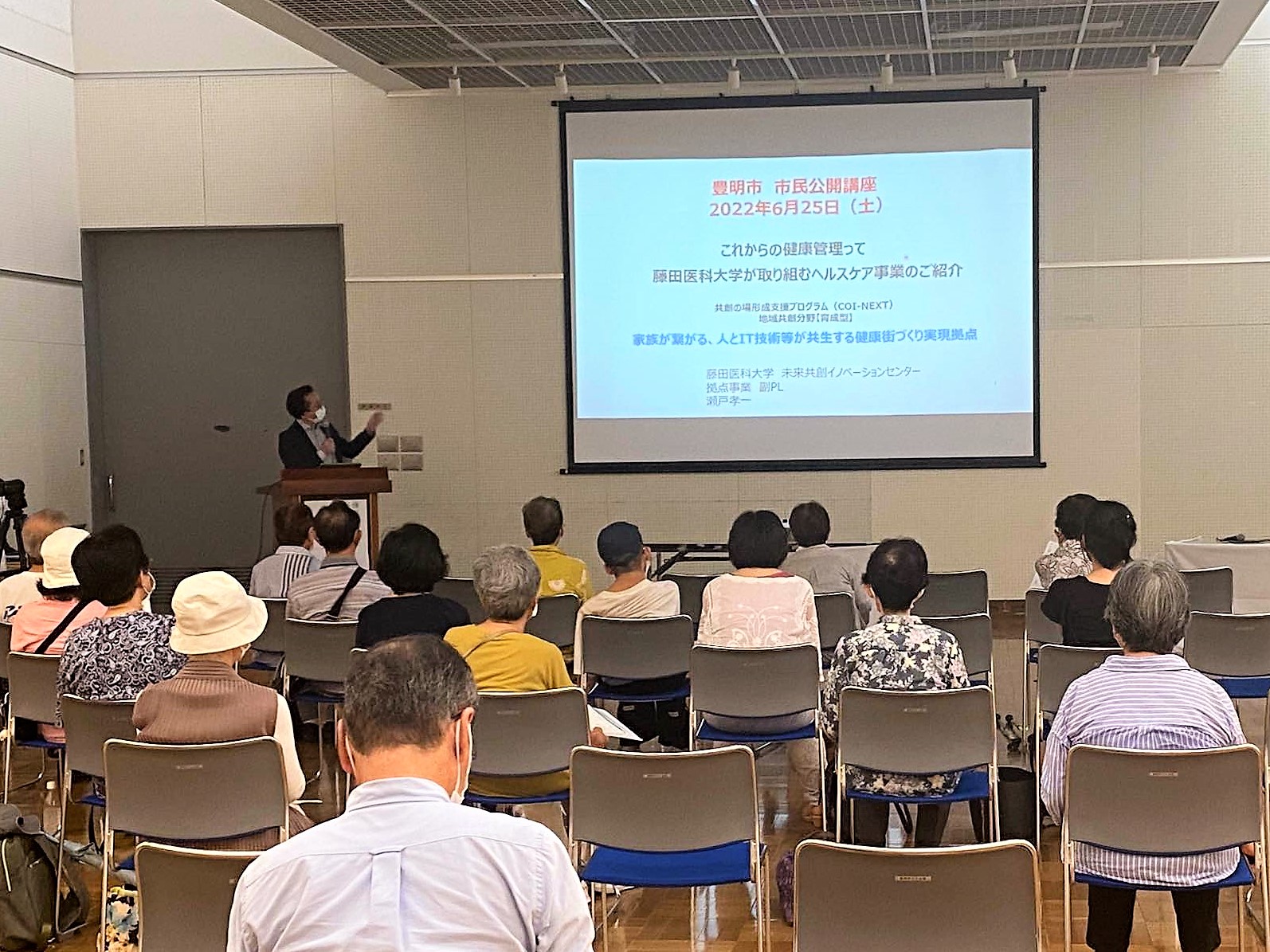 2022年6月25日(土)、豊明市文化会館にて本学は豊明市、株式会社スギ薬局、株式会社トプコンとともに、市民公開講座「健康管理ってどうすればいいの?」を開催しました。