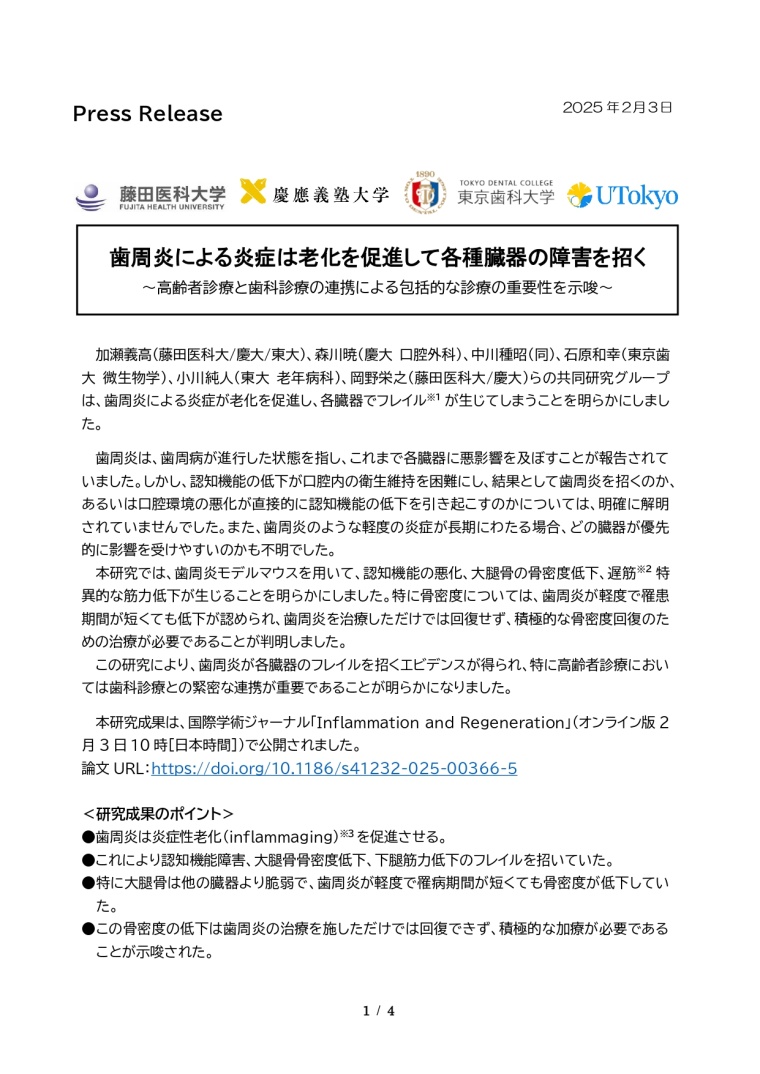 歯周炎による炎症は老化を促進して各種臓器の障害を招く