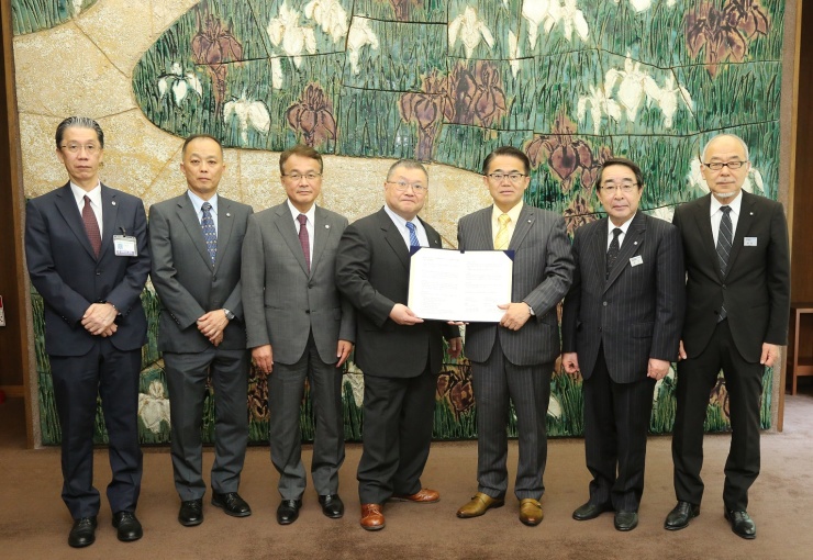 締結式は、2019年6月4日に愛知県公館で行われ、才藤栄一学長、湯澤由紀夫統括副学長・病院長、吉川哲史副学長、石原慎学長補佐、大村秀章愛知県知事、木下平病院事業庁長、服部義あいち小児保健医療総合センター長が出席しました。