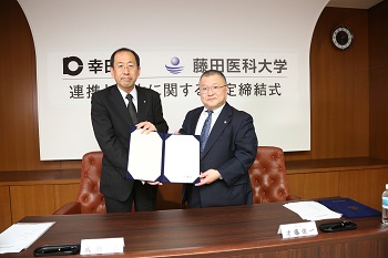 左から 幸田町 成瀬敦 町長、藤田医科大学 才藤栄一 学長