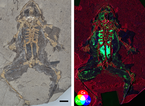 図1. リブロス(スペイン)で発見された1000万年前のカエルの化石。X線蛍光図(右)は内臓に銅と亜鉛が多いことを示す。藤田医大提供