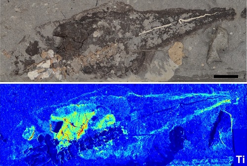 図2. リブロス(スペイン)で発見された1000万年前のオタマジャクシの化石。X線蛍光図(下)は皮膚、眼、特に肝臓にチタンが多いことを示す。藤田医大提供