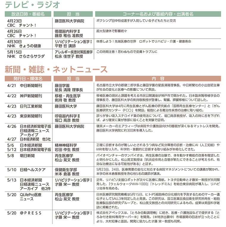 本学園の取り組みや研究・医療ニュース等に関する記事の掲載、教職員のTV出演情報です。