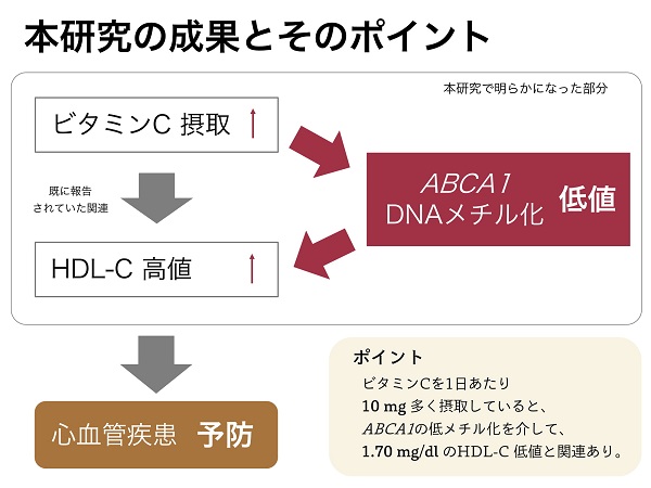 そこで、ABCA1 DNAメチル化を変化させる生活習慣として、野菜の摂取とりわけ食事中のビタミン摂取に着目しました。これらの摂取量とABCA1 DNAメチル化率との関連、さらにそれを介したHDLコレステロール値との関連を約230名の日本人集団を対象として検討しました(図1)。その結果、ビタミンCの摂取量が多い人は、ABCA1 DNAメチル化低値を介して、血清HDLコレステロール値が高いということを明らかにしました。今回の研究成果は、ビタミンCの循環器疾患に対する予防的な効果をABCA1のDNAメチル化が媒介している可能性を示唆するものであり、一般的な日本人集団においての循環器疾患予防について新たな分子メカニズムとなり得ると考えています。