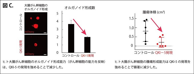 まず、大腸がんの手術検体よりがん幹細胞を分離し、754種類のマイクロRNAの発現をスクリーニングしました。その結果、特にmiR-221が、がん幹細胞でのみ非常に高発現していることが明らかになりました。また、がんゲノムデータベースの解析からmiR-221が高発現している大腸がんの患者は、低発現の患者に比べ予後不良であることが分かりました(図A)。増殖・分化し腫瘍形成をするなどのがん幹細胞のもつ基本的な機能は、miR-221発現を抑えることで顕著に抑制されました(図B)。また、miR-221ががん幹細胞遺伝子として働く際には、RNA結合タンパク質QKI-5を標的として抑制することが重要であることを見出しました。QKI-5の発現を強めると、miR-221を抑制した時と同様にがん幹細胞のもつ基本的な機能は抑制されました(図C)。