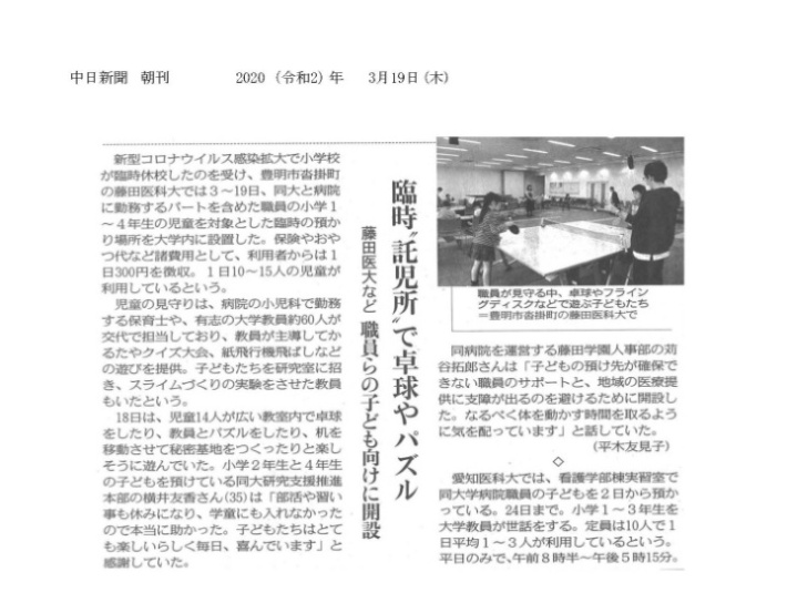 新型コロナウイルス感染拡大防止を目的とした全国の小・中・高等学校等の臨時休校を受け、子の預け先が確保できない教職員の就労サポートとして、本学内(豊明市)で臨時の児童預かりを行っています。