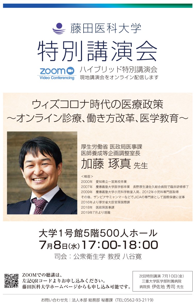 【開催延期のお知らせ】7月8日(水)の藤田医科大学主催 ハイブリッド形式特別講演会に厚生労働省 加藤琢真先生にご登壇いただく予定でしたが、開催を延期とさせていただきます。