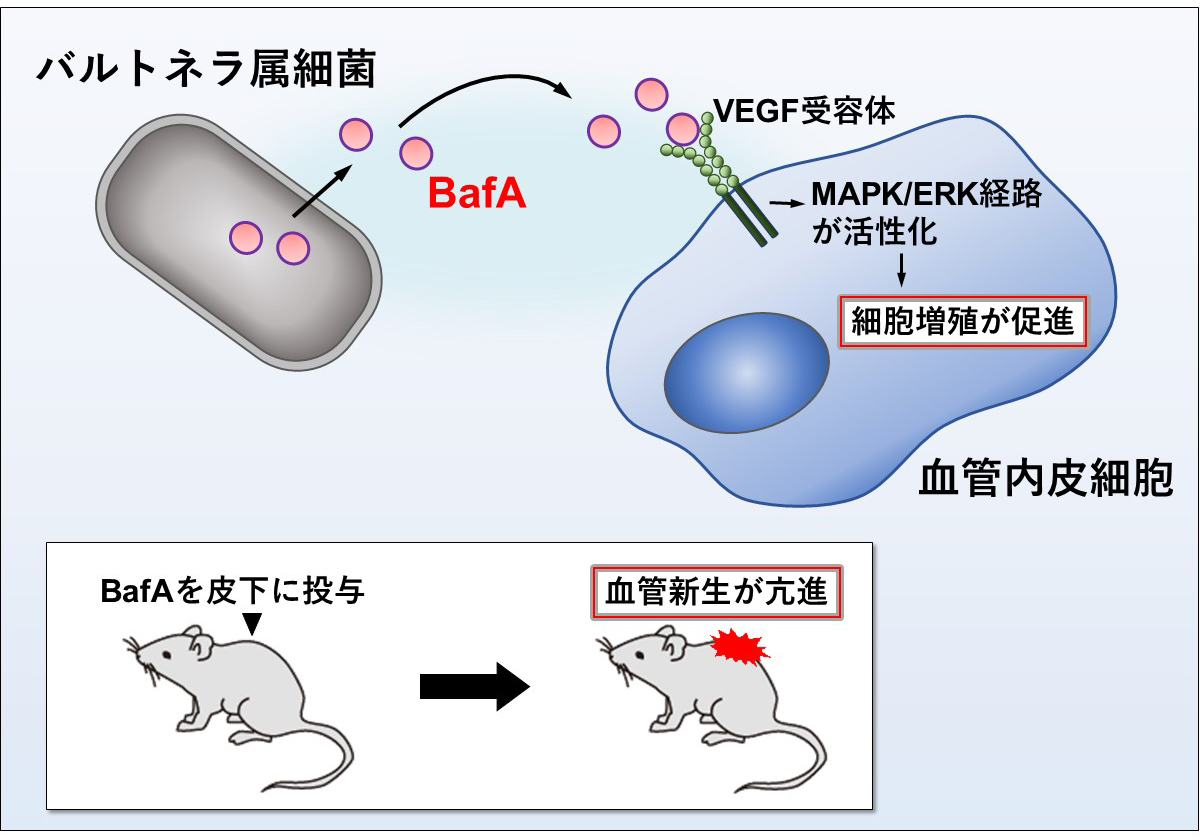 血管新生とは、既存の血管から新たな血管が形成される重要な生理的現象で、VEGF(Vascular Endothelial Growth Factor 血管内皮細胞増殖因子)に代表される血管新生因子によって促されます。これまでVEGFやその類似因子は魚類からほ乳類まで幅広く存在することが知られていましたが、細菌由来のものは見つかっていませんでした。同グループは、バルトネラ属細菌が血管腫(血管が拡張したり増えたりすることによってできる良性の腫瘍)を形成することに着目し、菌から分泌されるタンパク質の1つ(BafA)が血管内皮細胞を増殖させ、その結果、血管新生を起こすことをヒトの細胞とマウスを用いて証明しました。この研究成果により、バルトネラ属細菌特有の病態形成機構の一端が解明され、今後、バルトネラ感染症の診断や治療への応用、さらにはこの新規血管新生因子BafAを基にした“血管新生を制御する薬”の開発や再生医療分野への応用にもつながることが期待されます。
