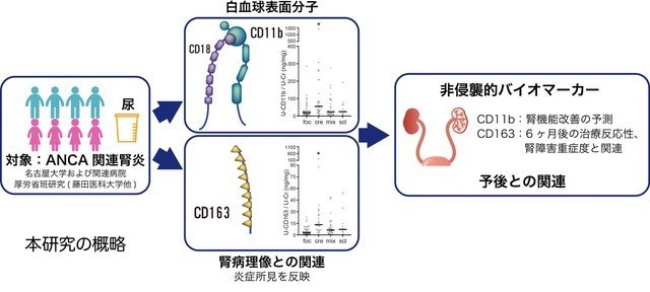 研究チームは、糸球体腎炎では炎症を引き起こす白血球由来の分子が尿中に漏れることをこれまでの研究で明らかにしてきました。今回、名古屋大学医学部附属病院およびその関連病院(88例)、藤田医科大学など大学病院を含む基幹病院(138例)で収集されたANCA関連腎炎患者生体試料での検討により、血管への接着に必要な分子であるCD11bと異物除去に必要な分子であるCD163のそれぞれをもつ白血球が、糸球体内の、特に治療反応性が期待できる新鮮な半月体で増加し、かつCD11bとCD163が尿中でも増加することを見出しました。さらに両分子の値と腎臓の予後との関連を検討した結果、診断時尿中CD163値は、6ヶ月後の治療で寛解に至らなかった、あるいは腎機能重症度が高い患者で増加しており、一方診断時尿中CD11b値は発症後2年までの腎機能の平均改善度を予測する因子であることが明らかとなりました。