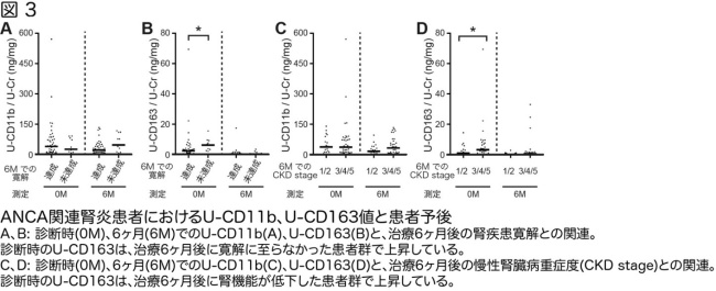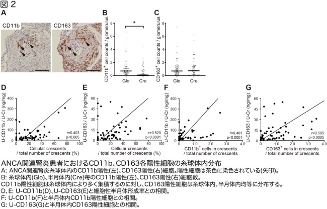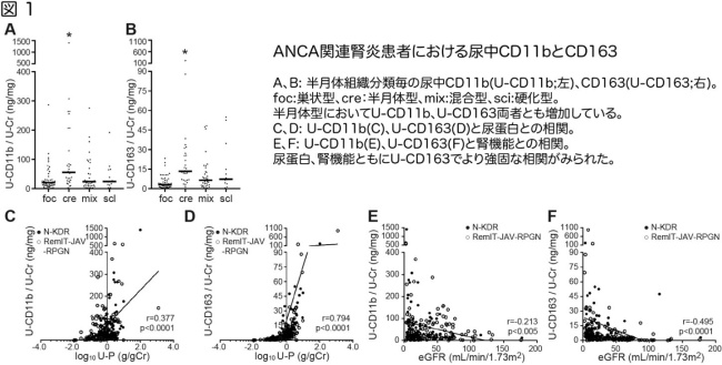 ●名古屋大学医学部附属病院とその関連病院(88例)、および藤田医科大学病院など大学病院を含む中核病院(138例)で収集されたANCA関連腎炎患者の尿中では、白血球表面分子であるCD11bとCD163が上昇しており、両者は治療反応性の高い細胞性半月体形成と関連した。また、診断時の尿中CD163値は、6ヶ月間の免疫抑制治療に反応の悪い、あるいは腎機能が低下した患者で上昇していた。一方、診断時の尿中CD11b値は、治療後の腎機能改善度と関連していた。