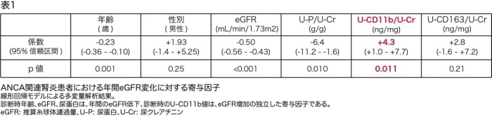 治療後の腎予後に関する検討では、尿中CD163値は、治療6ヶ月後に有意に減少しましたが、未寛解あるいは腎機能障害が重度となった患者群では、診断時にすでに上昇していることが明らかとなりました (図3)。以上の結果は尿中CD11b値ではみられませんでしたが、診断時における両分子尿中漏出量と2年後までの腎機能低下率との関連を、他の臨床的パラメーターを加えて検討したところ、年齢、腎機能低下、尿蛋白量が最長2年間の腎機能悪化の予期因子であるのに対し、尿中CD11b値は腎機能改善を予見する独立した因子であることが明らかになりました。一方、尿中CD163は腎予後を推定する因子とはなりませんでした(表1)。