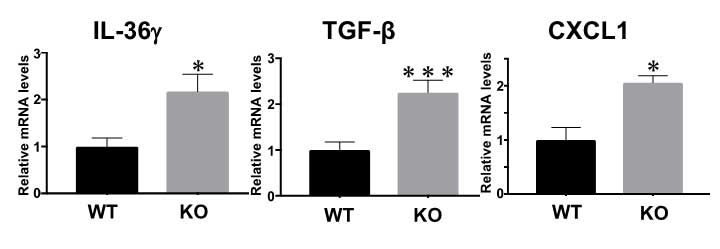 2:組織中のサイトカイン、ケモカインの評価ではIl36rn-/-マウスは野生型マウスと比較してIL-36γ、TGF-β、CXCL1の有意な増加を認めた。