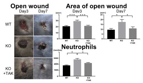 - TLR4阻害薬であるTAK-242をそれぞれのマウスに投与し、創傷治癒過程において与える影響について検討した。