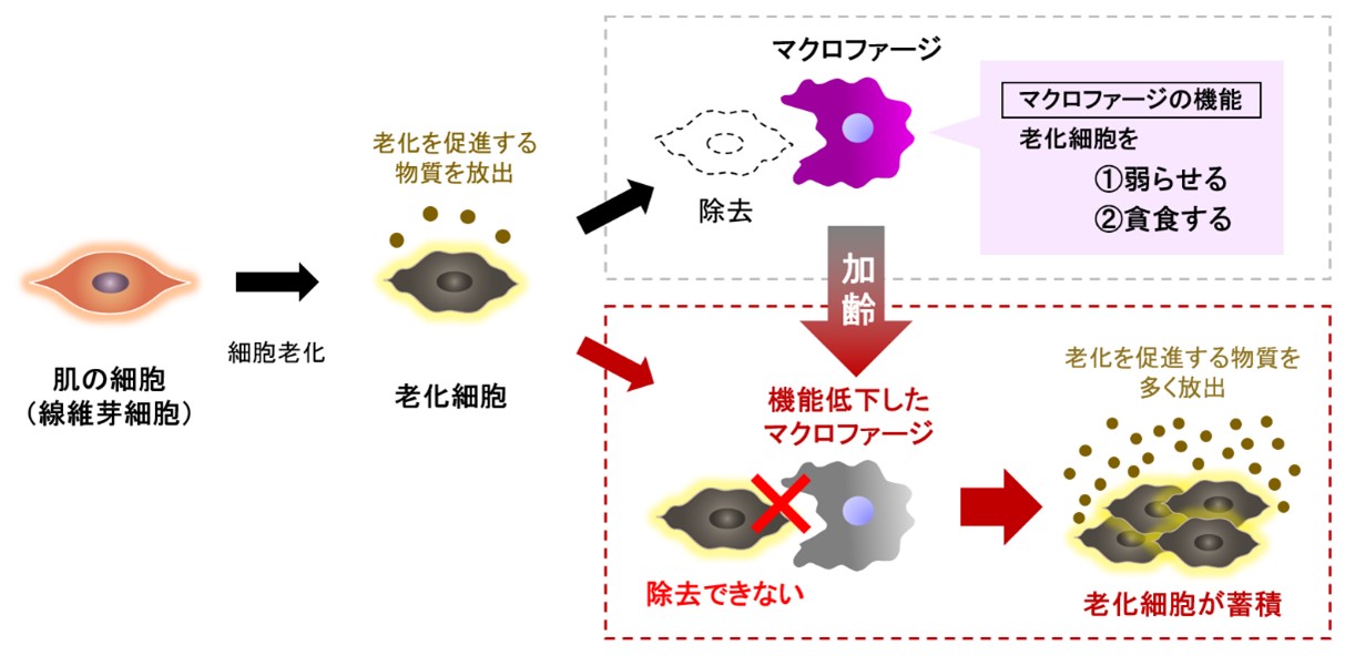 本来、老化した細胞(老化細胞)は免疫細胞の一種である「マクロファージ」と呼ばれる細胞によって除去されます。このマクロファージに着目し、肌の中において老化細胞を除去するメカニズムを研究した結果、老化細胞を「弱らせる」、「貪食する」という2段階の機構で除去していることを発見しました(参考資料2)。