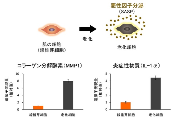 加齢とともに様々な臓器に蓄積する老化細胞は、炎症性物質など、組織の老化を促進する物質(悪性因子)を周囲に分泌することが知られ、この現象は細胞老化随伴分泌現象(SASP : Senescence associated secretory phenotype)と呼ばれています。20代と60代の皮膚組織を比較すると、60代の方が多くの老化細胞が蓄積していることが分かりました(図1)。これらの老化細胞は、周囲に悪性因子を分泌することで、皮膚組織にダメージを与えます(図2:データは真皮の線維芽細胞のもの)。