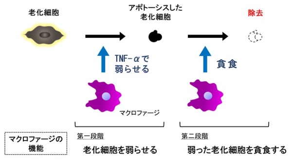 図3 マクロファージによる二段階の老化細胞の除去メカニズム
