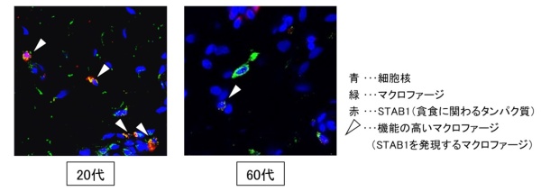 20代と60代の真皮におけるマクロファージについて解析したところ、60代では老化細胞の貪食に必要なタンパク質(STAB1)の発現が低下していることが明らかになりました(図4)。すなわち、加齢によりマクロファージの貪食機能が衰え、老化細胞をすみやかに除去できなくなるため、生体組織内に老化細胞の蓄積が引き起こされると考えられました。