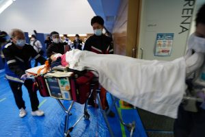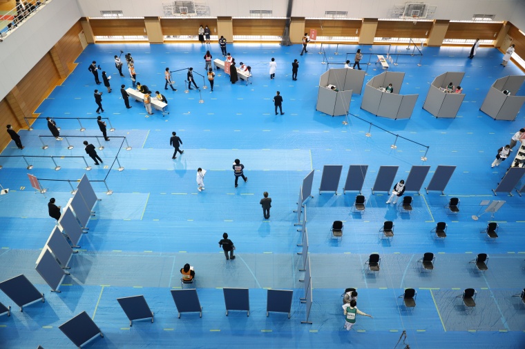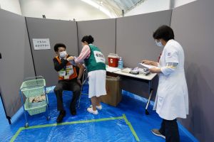 病院や大学の教職員約100人が参加し、大学体育館で実施しました。訓練は1時間に50人の接種を想定して行われ、参加者は検温や予診の後、4カ所設置された接種ブースで注射を打つ流れを確認しました。参加者は、接種後に体調不良やアナフィラキシーショックが出ないかを確認するために15分ほど待期、訓練では急激なアレルギー反応が出た人への対応も想定し、応急処置やドクターカーを使った救急搬送も行われました。