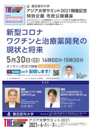 日本におけるワクチンと治療薬開発のトップランナーの大阪大学・松浦善治特任教授と本学 ・土井洋平教授が、新型コロナウイルス感染症(COVID-19)におけるワクチンおよび治療薬開発の最前線を紹介する特別講演会を開催します。