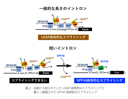 - ヒトのmRNA前駆体において、短いイントロンの一群が既知のスプライシング因子U2AF二量体に代わって、新しいスプライシング因子SPF45でスプライシングされていることを証明
