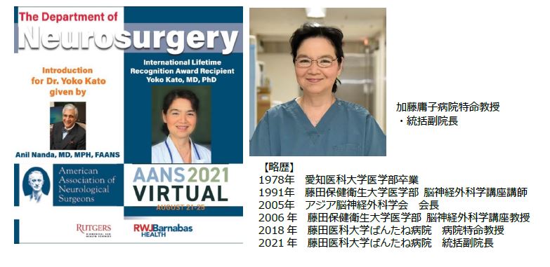 女性脳外科医 として 世界 初 藤田医科大学ばんたね病院 脳神経外科 加藤 庸子教授が 「 AANS International Lifetime Recognition Award」 受賞