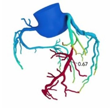 〈図 1〉血流の状態が数値で表示され、その数 値に応じて冠動脈が色分けされます。赤い部分 は血液の流れが特に悪くなっていることを意味 しています。