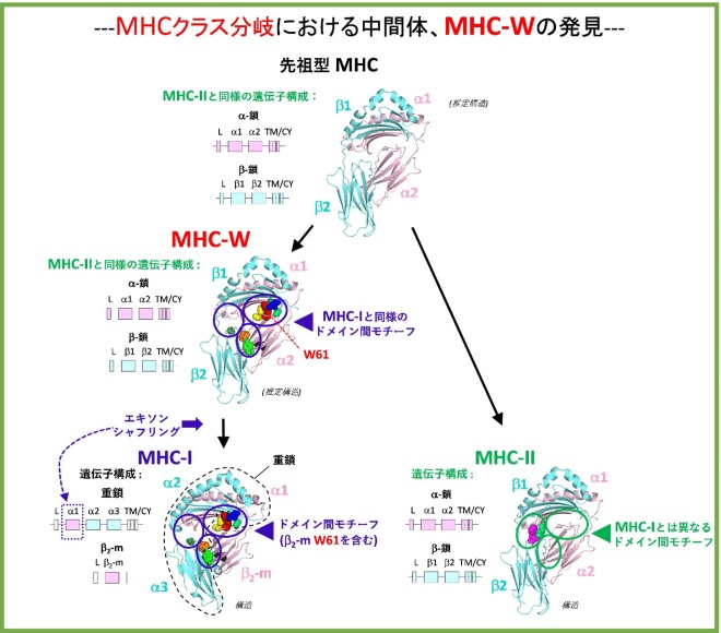 - MHC-Wは、MHC-IIとクラスII型のドメイン構成を共有している一方、MHC-Iとはドメイン間モチーフ配列を共有し、また系統樹解析で近縁であることを解明