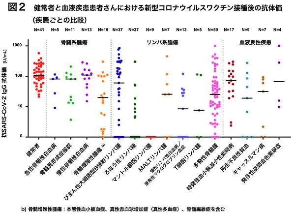 (2)血液疾患ごとに抗体獲得患者の割合には違いがあり、また同じ疾患の患者のなかでも獲得抗体価には個人差があります(図2)