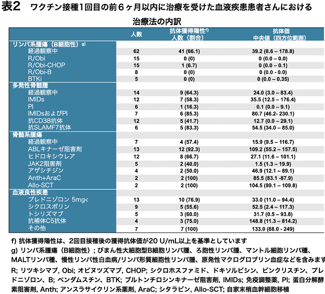 抗体獲得の状況には、病型のみならず、個々の患者における病気の状態や治療種類や実施時期なども影響を与えていることが推測されます。それぞれの疾患において実施されていた治療法、薬剤について、表2に示します。