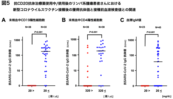 (5)抗CD20抗体治療薬を含む治療を実施中、実施後の患者において、末梢血中のCD19陽性細胞数はワクチン接種後の抗体価の上昇に有意に相関します