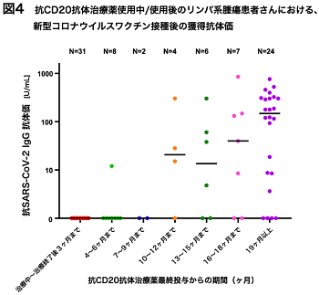 抗CD20抗体治療薬を含む治療を実施した患者は、投与終了後9カ月までは抗体獲得が困難であることが推測され、またそれ以上経過した患者においても、抗体獲得が困難である例が存在することがわかりました(図4)。このことは、疾患や治療薬の種類のみならず、それぞれの患者の身体の状況によって反応性が異なることを意味しており、臨床現場においても注意を要する所見と考えられました。