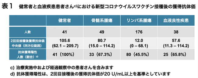 血液疾患治療中・治療後の患者の一部で、 新型コロナワクチン接種後の 抗体獲得が困難であることを確認しました