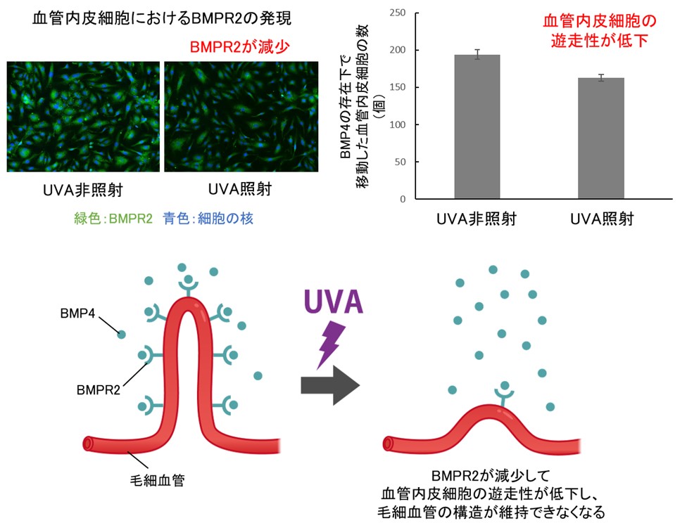 毛細血管の構造は、血管内皮細胞が移動(遊走)することで維持されています。そのため、血管内皮細胞の移動能力(遊走性)に関与するタンパク質(BMP4)及びその受容体(BMPR2)に着目しました。培養した血管内皮細胞に紫外線(UVA)を照射したところ、BMPR2の発現が低下しました。このことから、紫外線によってBMPR2の発現が低下することで血管を遊走させるBMP4を感知できなくなり、血管内皮細胞の遊走性が低下することで毛細血管が維持できずに消失すると考えられました。これを確かめるため、BMP4を用いて血管内皮細胞の遊走性を評価した結果、BMP4の存在下において、通常の血管内皮細胞と比較してUVAを照射した血管内皮細胞では遊走性が低下しました。以上のことから、露光部における毛細血管の消失は、UVA によるBMPR2の発現低下によって引き起こされると考えられました。