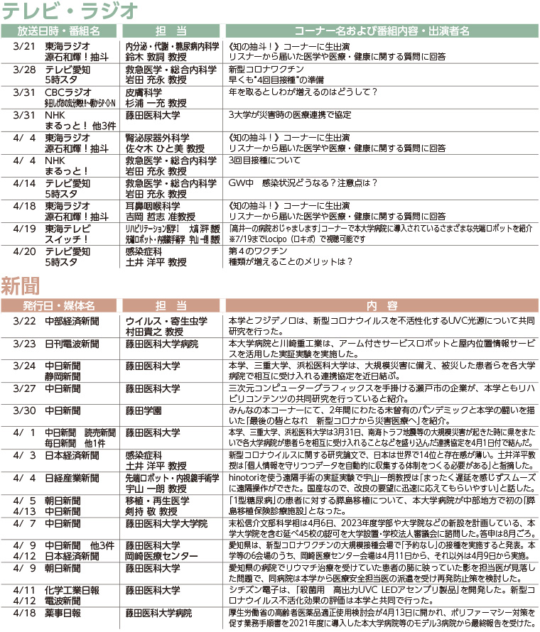 本学園の取り組みや研究・医療ニュース等に関する記事の掲載、教職員のTV出演情報です。