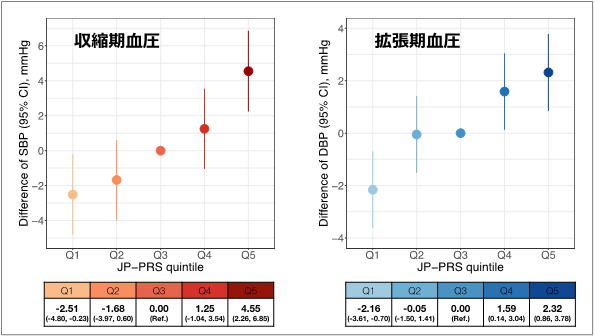 PRSの値に基づいて対象者を5つのグループに均等に分割してみると、高血圧保有の割合(%)はPRSの低いグループからそれぞれ41.3%、44.9%、46.2%、51.5%、59.5%でした。これは、PRSが高いほど実際に高血圧保有者が多いことを反映した結果です。さらに、収縮期血圧について、平均的なPRS群(3番目のグループ)に対して、最もPRSが高いグループ(5番目のグループ)では平均して4.6mmHg高いことが分かりました(図1左)。また、拡張期血圧でも同様に、最もPRSが高いグループでは平均して2.32mmHg血圧が高いことが分かりました(図1右)。