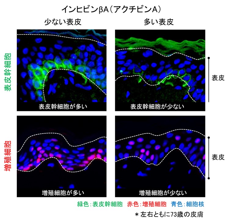 本研究から、インヒビンβA(アクチビンA)は表皮幹細胞の増殖を抑制することで表皮組織を菲薄化させると考えられました。そのため、加齢に伴うインヒビンβA(アクチビンA)の増加を抑制することができれば、表皮幹細胞の維持や表皮の老化防止につながると期待されます。