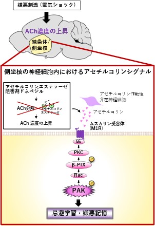 - ドネペジル(認知症治療薬)がM1R-PKC-β-PIXを介してPAKを活性化し、その結果、マウスの忌避学習・嫌悪記憶を促進することを示しました。
