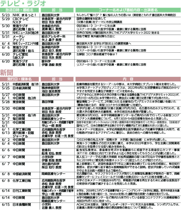 本学園の取り組みや研究・医療ニュース等に関する記事の掲載、教職員のTV出演情報です。