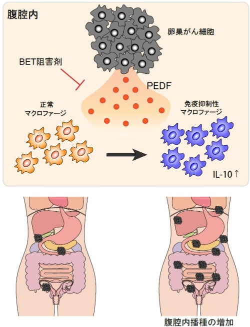 まず、腹腔内播種を繰り返して作成した高転移マウス卵巣がん細胞を用いて、卵巣がん細胞が分泌するタンパクとして、色素上皮由来因子(PEDF: Pigment epithelium-derived factor)を同定しました。PEDFは腹腔内でインターロイキン10(IL-10)を産生する免疫抑制性マクロファージを誘導することで、腹腔内に播種した卵巣がん細胞が免疫細胞からの攻撃を回避し、生存する手助けをしていることが分かりました。ヒトがんゲノムデータベース(TCGA :The Cancer Genome Atlas)を用いた解析でも、卵巣がんではPEDFとIL-10の発現量の間には強い相関があり、PEDFの発現量が多い方が予後不良であることがわかりました。さらにバイオバンクに保管されている卵巣がん患者検体を用いた解析で、腹水中及び血清中にもPEDFが分泌されていること、及び血清PEDFが高い患者では2年以内の再発率が高いことも明らかにしました。つまりPEDFが卵巣がんの予後を予測するバイオマーカーとしても有用性が高いことが分かりました。また、PEDFの発現を制御する分子として、BET(ブロモドメインおよびエクストラターミナル)タンパク質の一つであるBRD4分子を同定しました。BRD4分子は卵巣がんで高頻度に異常が見られることが既に知られています。最後に、BET阻害剤がマウスの生体内で卵巣がん細胞の生存を抑制することも明らかにしました。