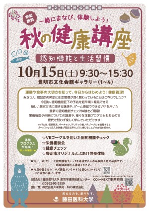 国立研究開発法人科学技術振興機構 共創の場形成支援プログラム(JST COI-NEXT)における藤田医科大学の拠点事業では、市民の健康意識向上を目的に、「食事」「運動」など身近なテーマで、市民の皆様が気軽に参加できる、健康相談ブース、実体験できる市民公開講座を開催しています。