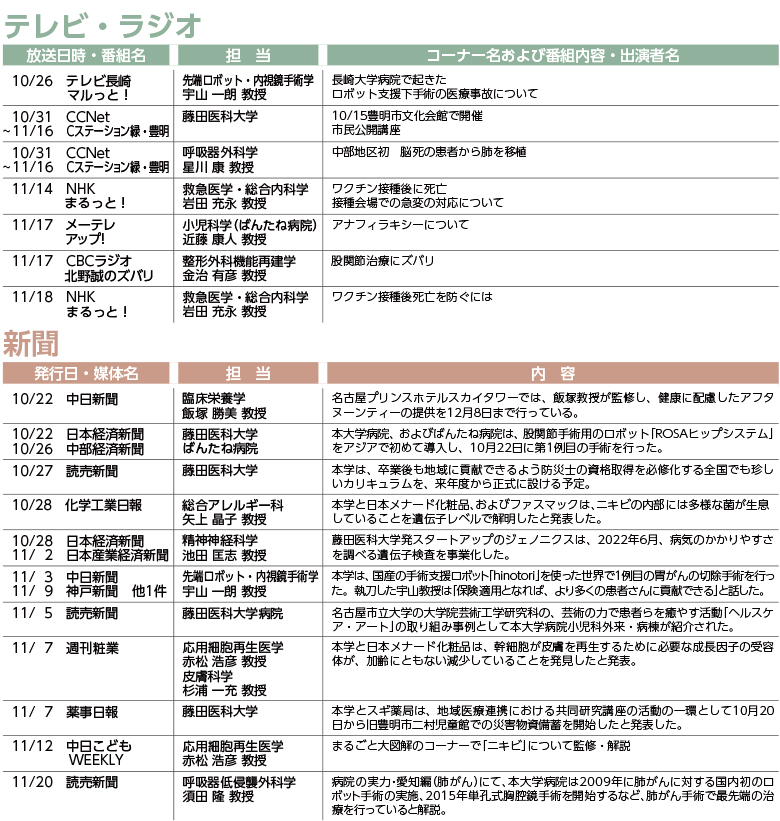 本学園の取り組みや研究・医療ニュース等に関する記事の掲載、教職員のTV出演情報です。